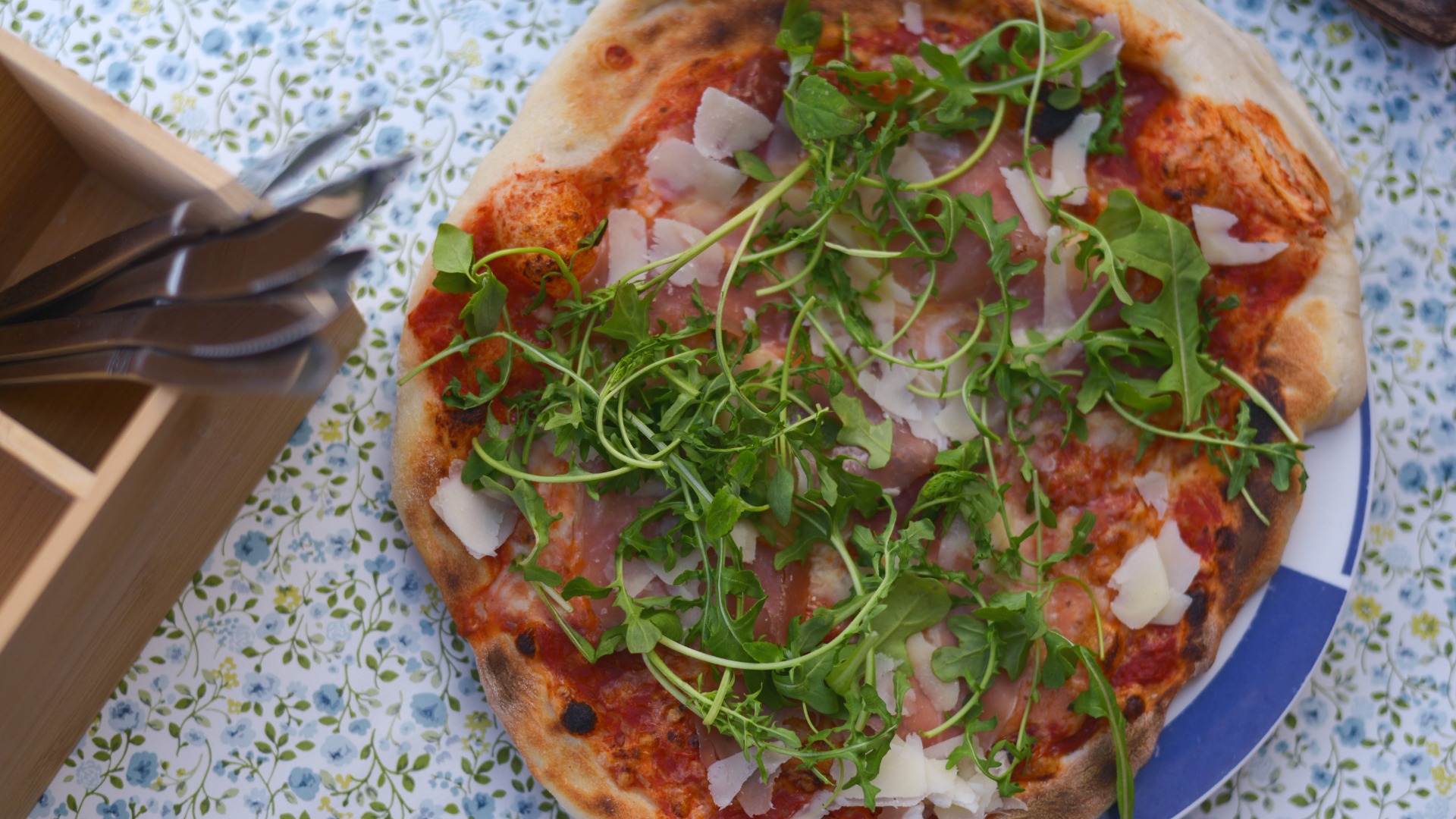 - Spekepizza med ruccola og parmesan (hvit eller rød saus)